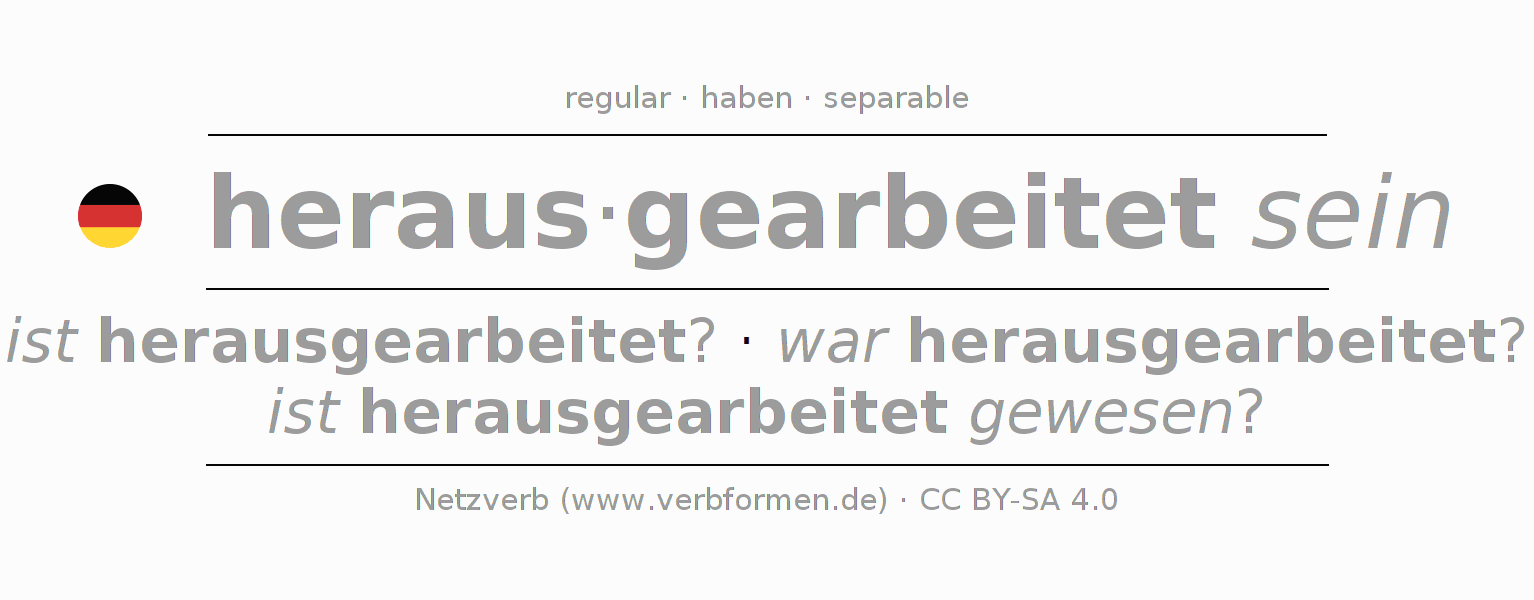 The conjugation of herausarbeiten in Present Indicative Presence Statal Passive is bin ich herausgearbeitet?, bist du herausgearbeitet?, ist er herausgearbeitet?, sind wir herausgearbeitet?, seid ihr herausgearbeitet?, sind sie herausgearbeitet?.The conjugation corresponds to certain grammatical rules. Likewise the requirements for the conjugation of the simple verb forms of herausarbeiten in Present. Comments ☆