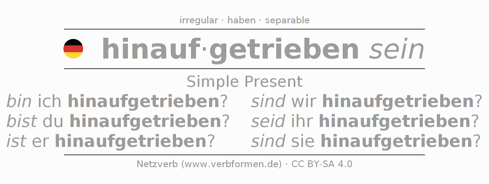 The conjugation of hinauftreiben in Present Indicative Presence Statal Passive is bin ich hinaufgetrieben?, bist du hinaufgetrieben?, ist er hinaufgetrieben?, sind wir hinaufgetrieben?, seid ihr hinaufgetrieben?, sind sie hinaufgetrieben?.The conjugation corresponds to certain grammatical rules. Likewise the requirements for the conjugation of the simple verb forms of hinauftreiben in Present. Comments ☆
