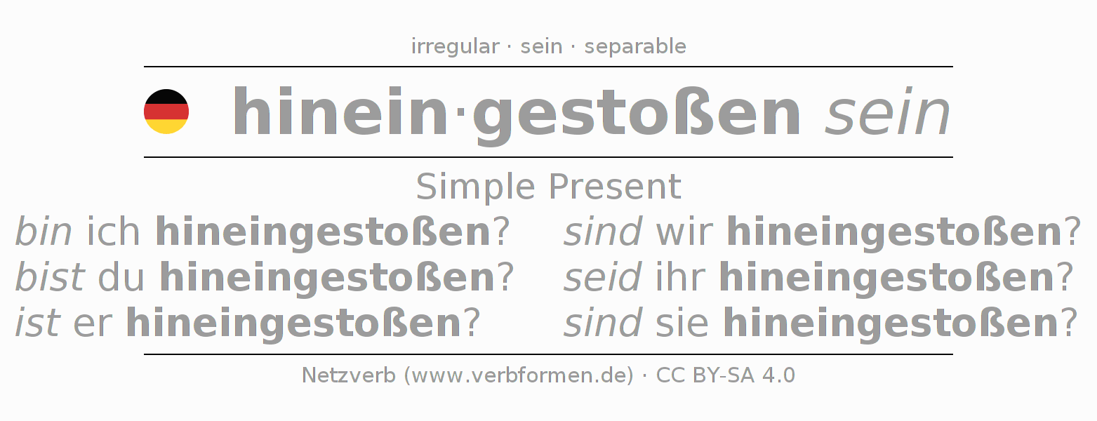 The conjugation of hineinstoßen in Present Indicative Presence Statal Passive is bin ich hineingestoßen?, bist du hineingestoßen?, ist er hineingestoßen?, sind wir hineingestoßen?, seid ihr hineingestoßen?, sind sie hineingestoßen?.The conjugation corresponds to certain grammatical rules. Likewise the requirements for the conjugation of the simple verb forms of hineinstoßen in Present. Comments ☆