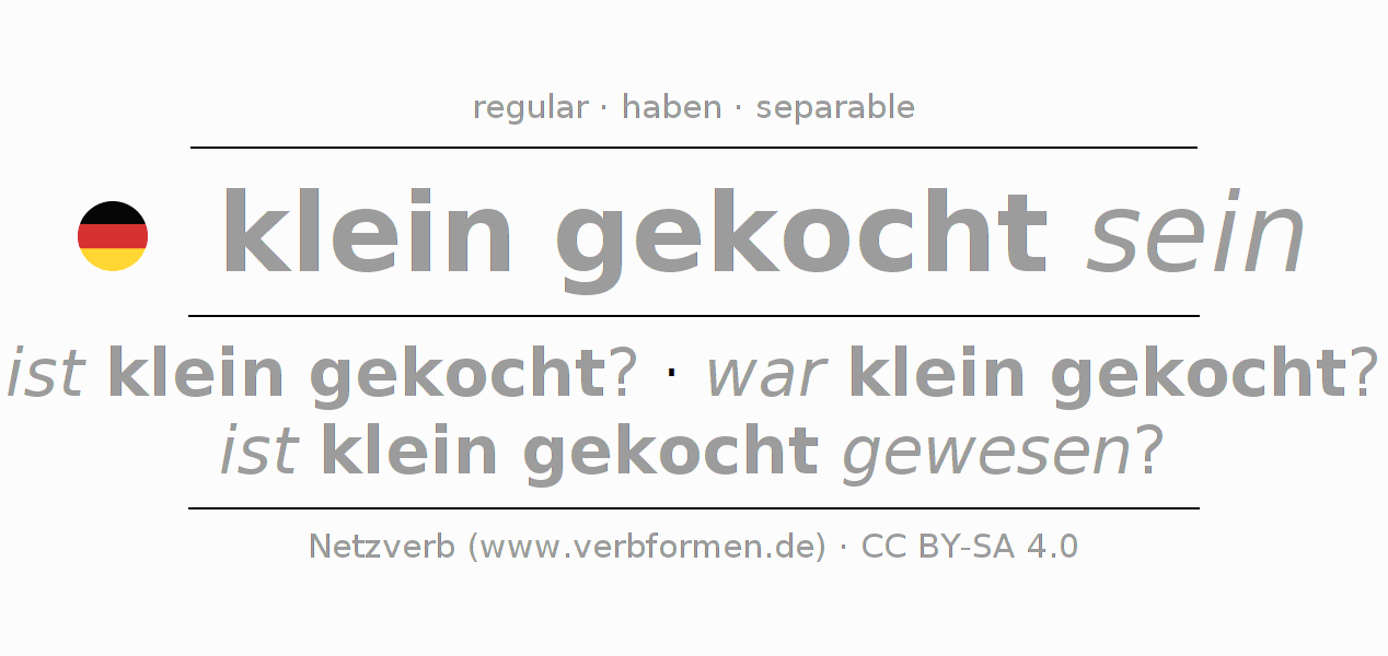 The conjugation of kleinkochen in Present Indicative Presence Statal Passive is bin ich klein gekocht?, bist du klein gekocht?, ist er klein gekocht?, sind wir klein gekocht?, seid ihr klein gekocht?, sind sie klein gekocht?.The conjugation corresponds to certain grammatical rules. Likewise the requirements for the conjugation of the simple verb forms of kleinkochen in Present. Comments ☆