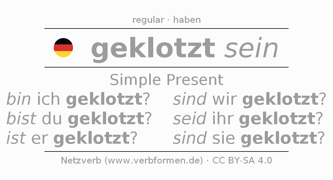 The conjugation of klotzen in Present Indicative Presence Statal Passive is bin ich geklotzt?, bist du geklotzt?, ist er geklotzt?, sind wir geklotzt?, seid ihr geklotzt?, sind sie geklotzt?.The conjugation corresponds to certain grammatical rules. Likewise the requirements for the conjugation of the simple verb forms of klotzen in Present. Comments ☆