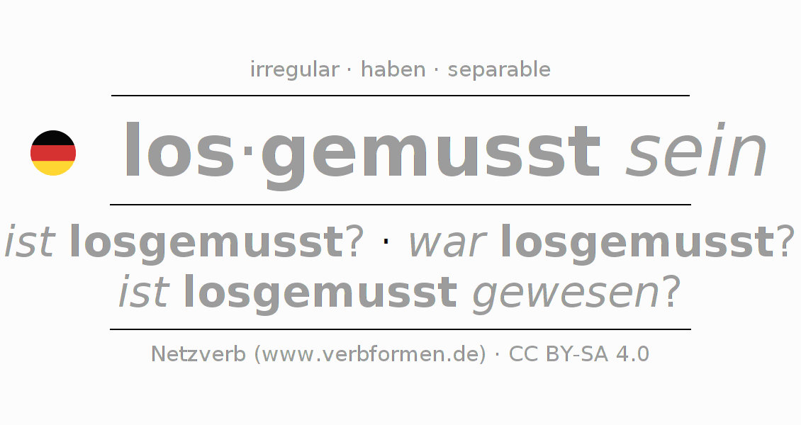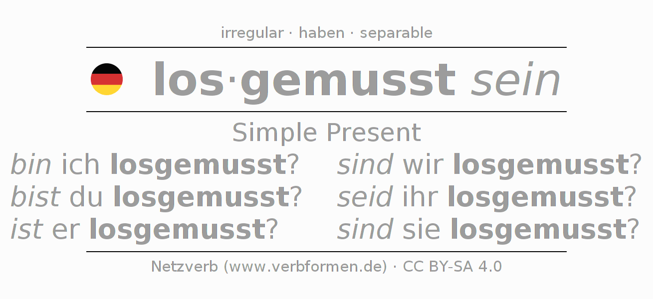The conjugation of losmüssen in Present Indicative Presence Statal Passive is bin ich losgemusst?, bist du losgemusst?, ist er losgemusst?, sind wir losgemusst?, seid ihr losgemusst?, sind sie losgemusst?.The conjugation corresponds to certain grammatical rules. Likewise the requirements for the conjugation of the simple verb forms of losmüssen in Present. Comments ☆