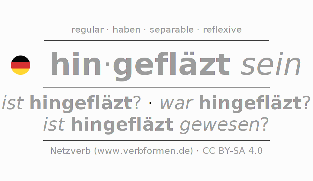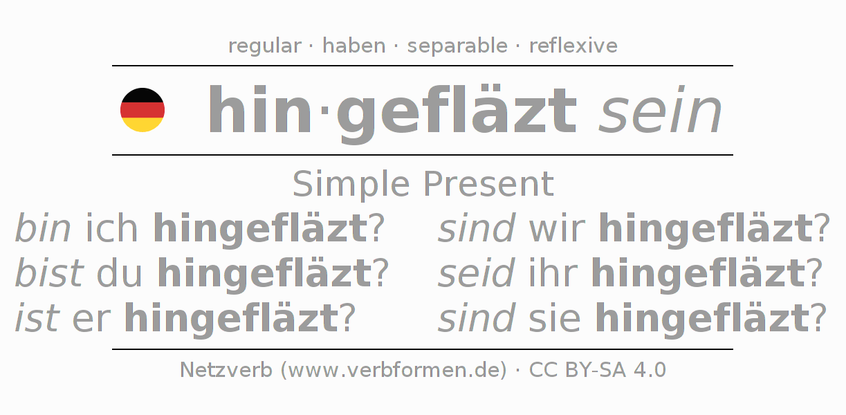 The conjugation of sich hinfläzen in Present Indicative Presence Statal Passive is bin ich hingefläzt?, bist du hingefläzt?, ist er hingefläzt?, sind wir hingefläzt?, seid ihr hingefläzt?, sind sie hingefläzt?.The conjugation corresponds to certain grammatical rules. Likewise the requirements for the conjugation of the simple verb forms of hinfläzen in Present. Comments ☆