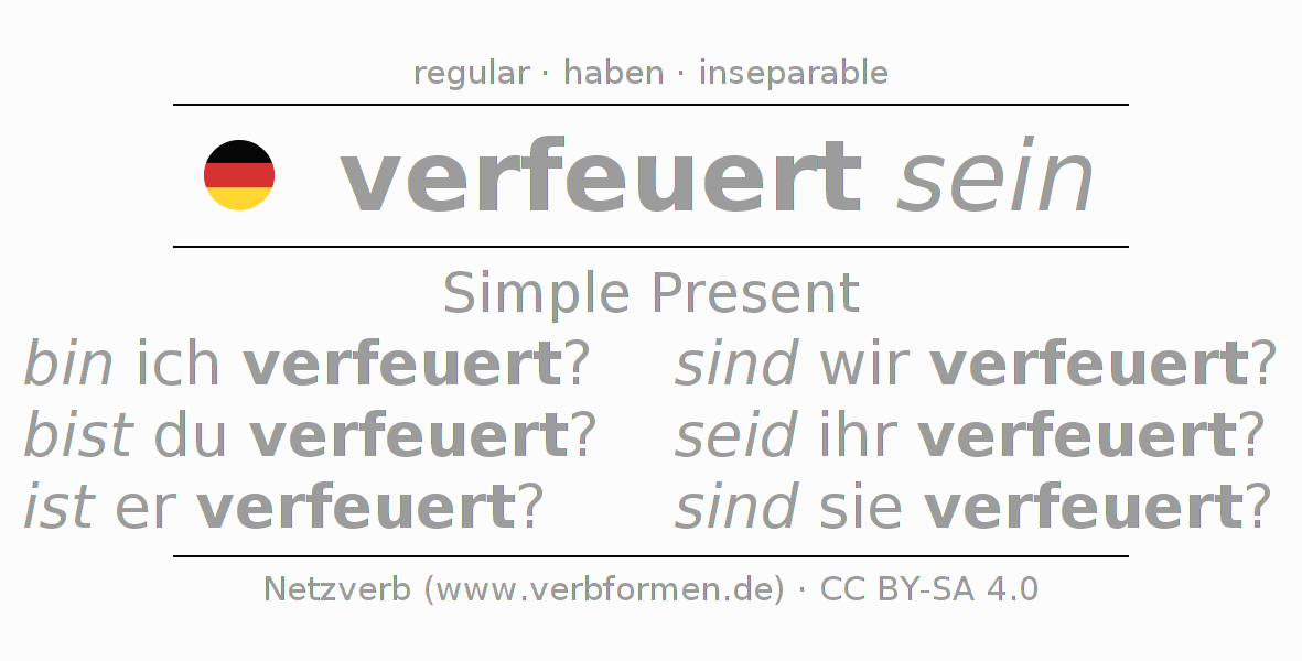 The conjugation of verfeuern in Present Indicative Presence Statal Passive is bin ich verfeuert?, bist du verfeuert?, ist er verfeuert?, sind wir verfeuert?, seid ihr verfeuert?, sind sie verfeuert?.The conjugation corresponds to certain grammatical rules. Likewise the requirements for the conjugation of the simple verb forms of verfeuern in Present. Comments ☆