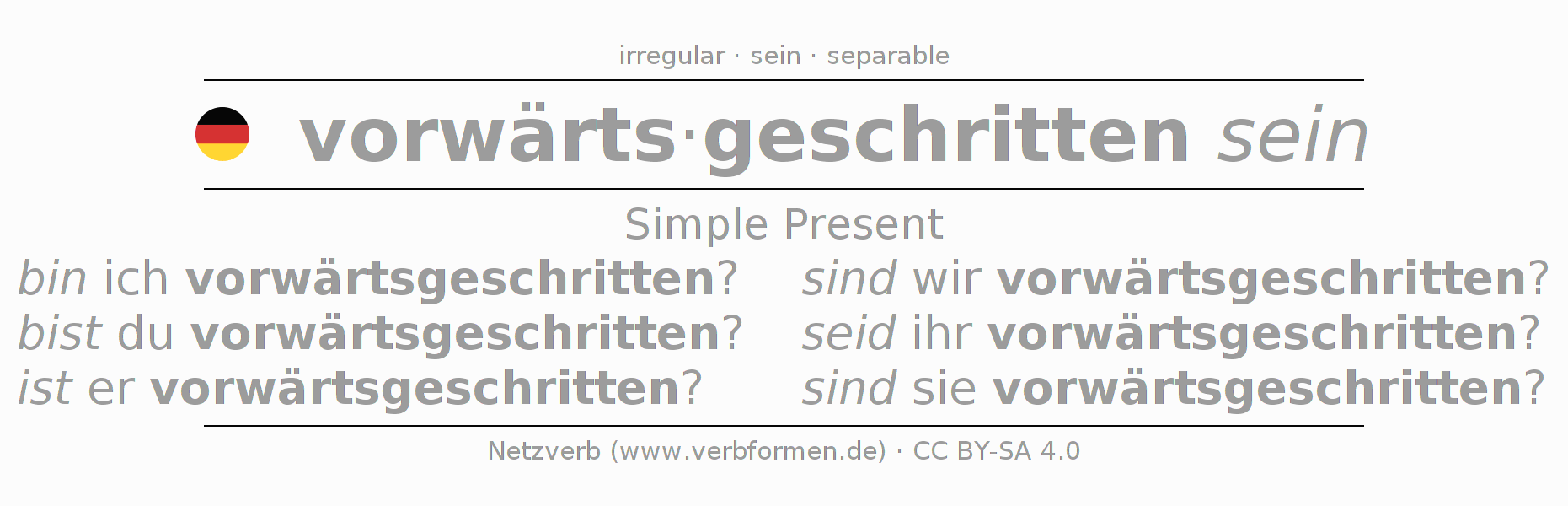 The conjugation of vorwärtsschreiten in Present Indicative Presence Statal Passive is bin ich vorwärtsgeschritten?, bist du vorwärtsgeschritten?, ist er vorwärtsgeschritten?, sind wir vorwärtsgeschritten?, seid ihr vorwärtsgeschritten?, sind sie vorwärtsgeschritten?.The conjugation corresponds to certain grammatical rules. Likewise the requirements for the conjugation of the simple verb forms of vorwärtsschreiten in Present. Comments ☆