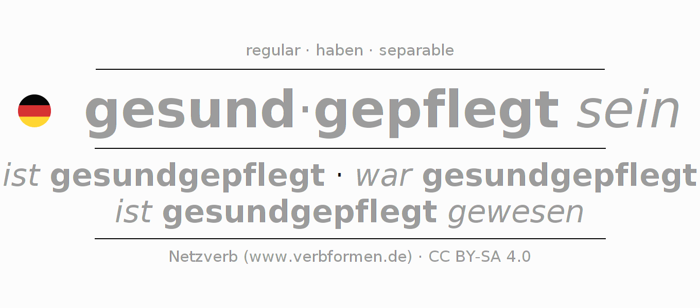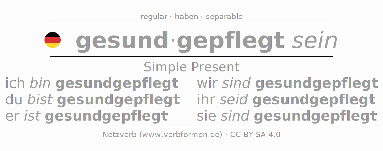 The conjugation of gesundpflegen in Present Indicative Presence Statal Passive is ich bin gesundgepflegt, du bist gesundgepflegt, er ist gesundgepflegt, wir sind gesundgepflegt, ihr seid gesundgepflegt, sie sind gesundgepflegt.The conjugation corresponds to certain grammatical rules. Likewise the requirements for the conjugation of the simple verb forms of gesundpflegen in Present. Comments ☆