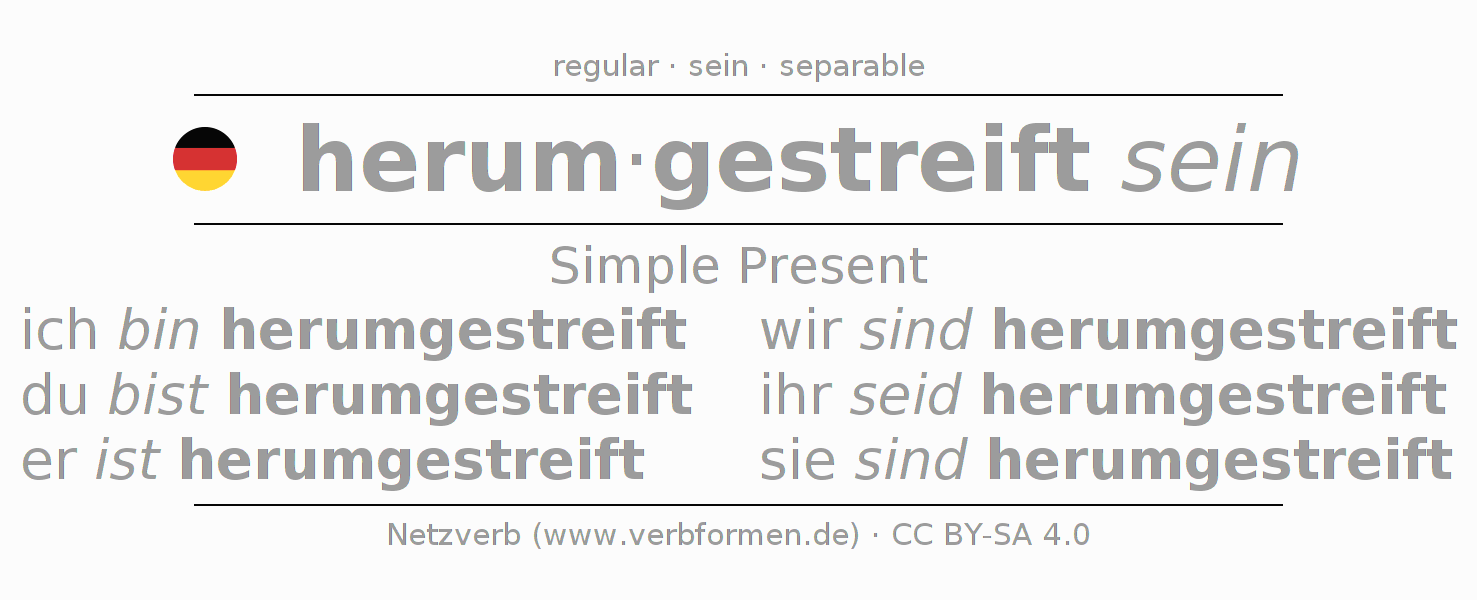 The conjugation of herumstreifen in Present Indicative Presence Statal Passive is ich bin herumgestreift, du bist herumgestreift, er ist herumgestreift, wir sind herumgestreift, ihr seid herumgestreift, sie sind herumgestreift.The conjugation corresponds to certain grammatical rules. Likewise the requirements for the conjugation of the simple verb forms of herumstreifen in Present. Comments ☆