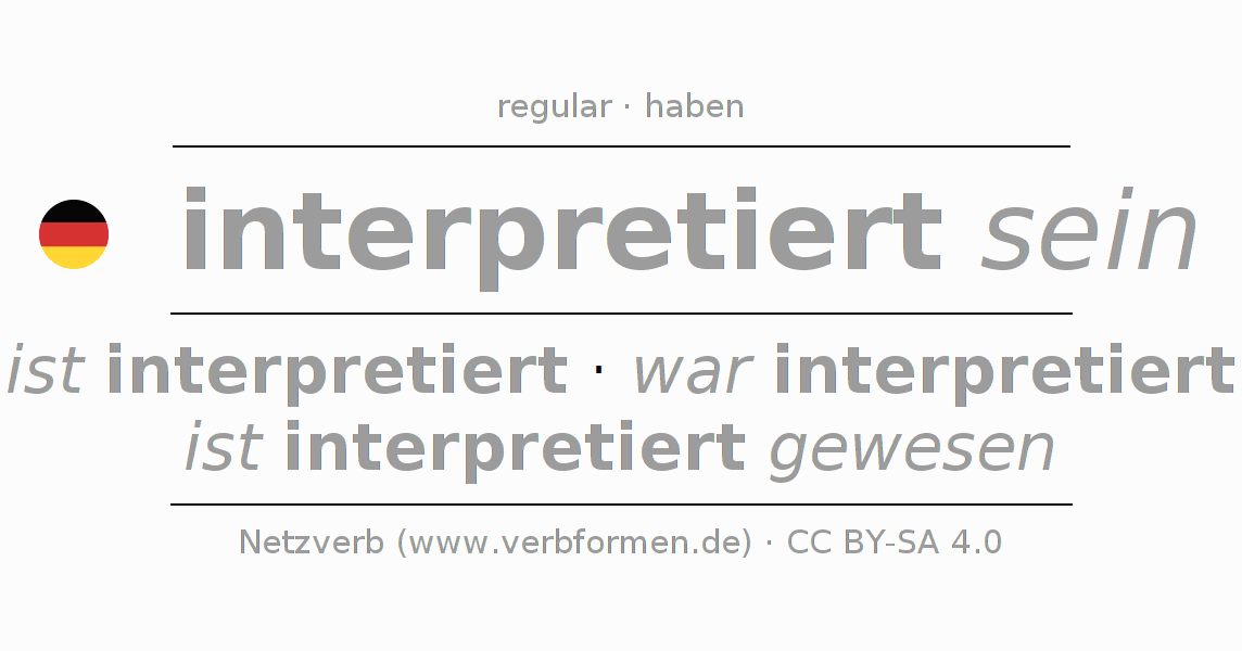 The conjugation of interpretieren in Present Indicative Presence Statal Passive is ich bin interpretiert, du bist interpretiert, er ist interpretiert, wir sind interpretiert, ihr seid interpretiert, sie sind interpretiert.The conjugation corresponds to certain grammatical rules. Likewise the requirements for the conjugation of the simple verb forms of interpretieren in Present. Comments ☆