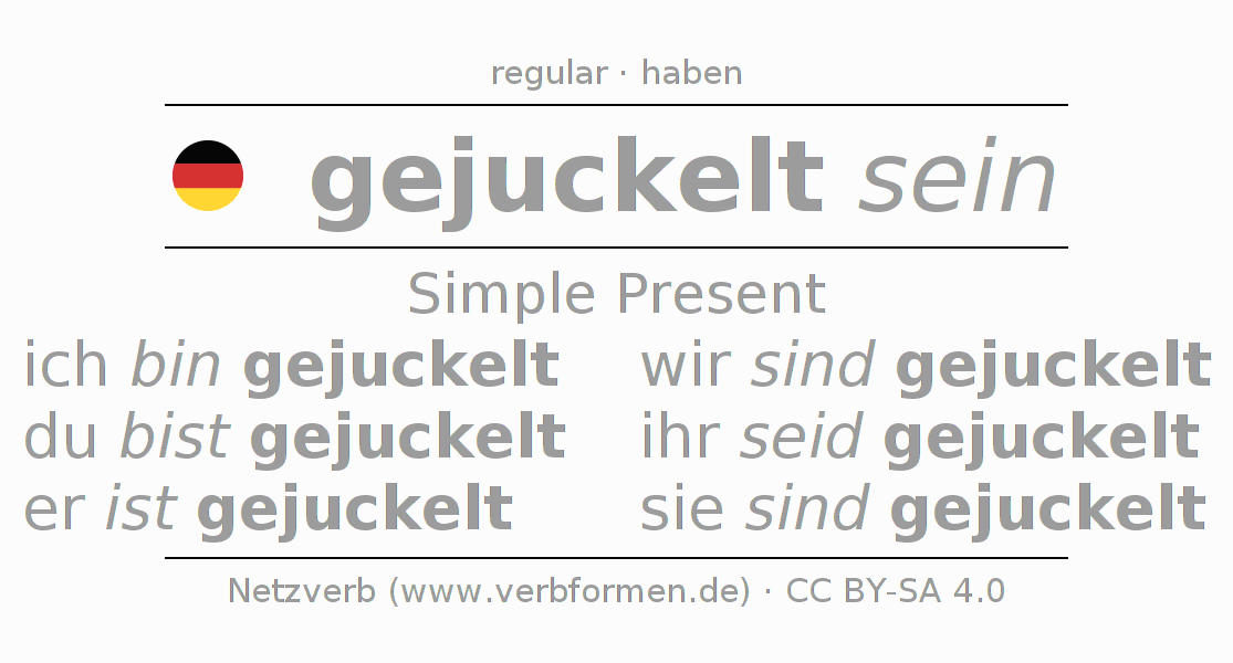 The conjugation of juckeln in Present Indicative Presence Statal Passive is ich bin gejuckelt, du bist gejuckelt, er ist gejuckelt, wir sind gejuckelt, ihr seid gejuckelt, sie sind gejuckelt.The conjugation corresponds to certain grammatical rules. Likewise the requirements for the conjugation of the simple verb forms of juckeln in Present. Comments ☆