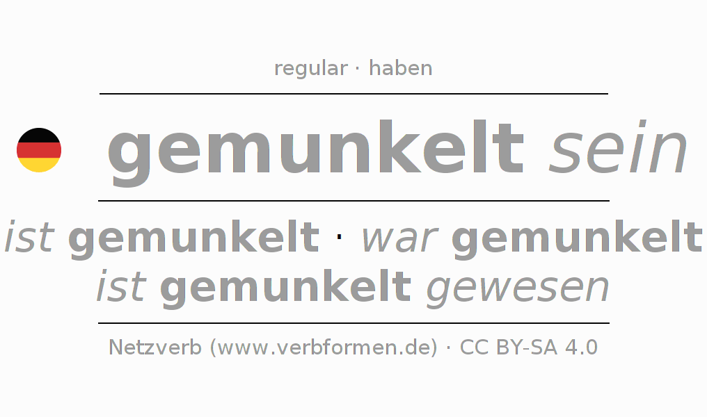 The conjugation of munkeln in Present Indicative Presence Statal Passive is ich bin gemunkelt, du bist gemunkelt, er ist gemunkelt, wir sind gemunkelt, ihr seid gemunkelt, sie sind gemunkelt.The conjugation corresponds to certain grammatical rules. Likewise the requirements for the conjugation of the simple verb forms of munkeln in Present. Comments ☆