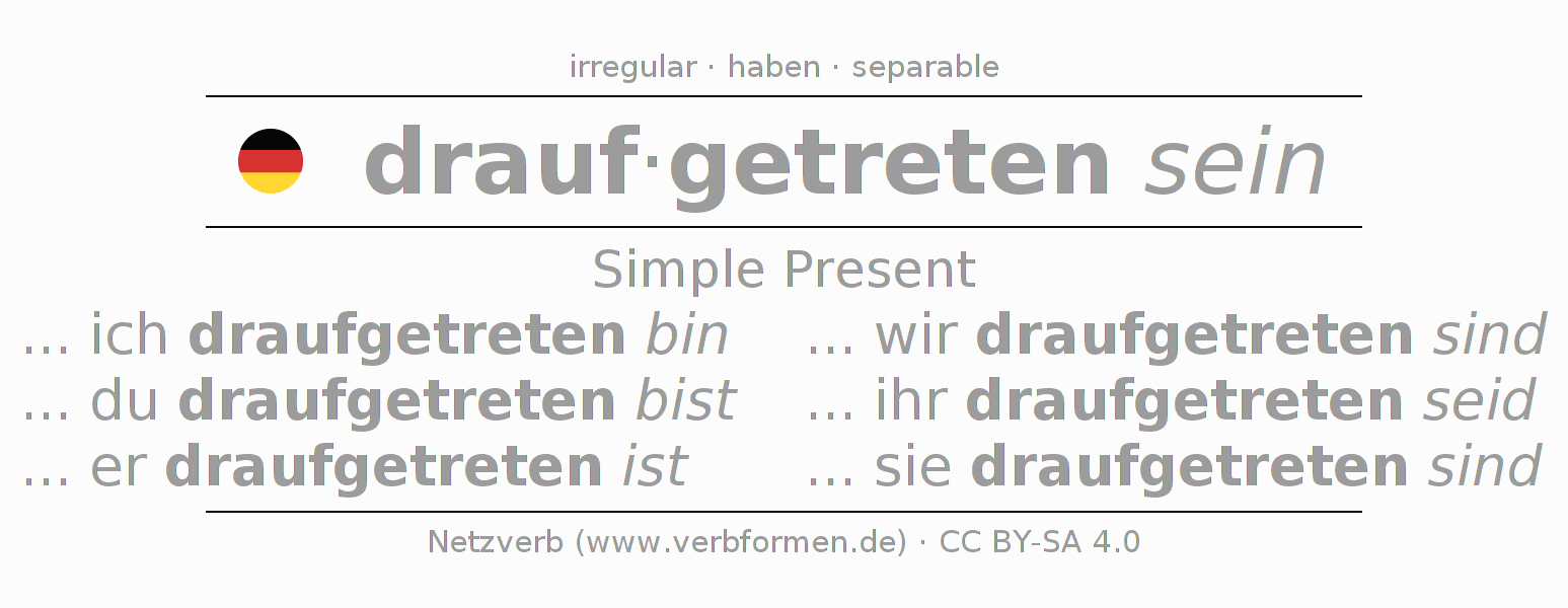 The conjugation of drauftreten in Present Indicative Presence Statal Passive is ... ich draufgetreten bin, ... du draufgetreten bist, ... er draufgetreten ist, ... wir draufgetreten sind, ... ihr draufgetreten seid, ... sie draufgetreten sind.The conjugation corresponds to certain grammatical rules. Likewise the requirements for the conjugation of the simple verb forms of drauftreten in Present. Comments ☆