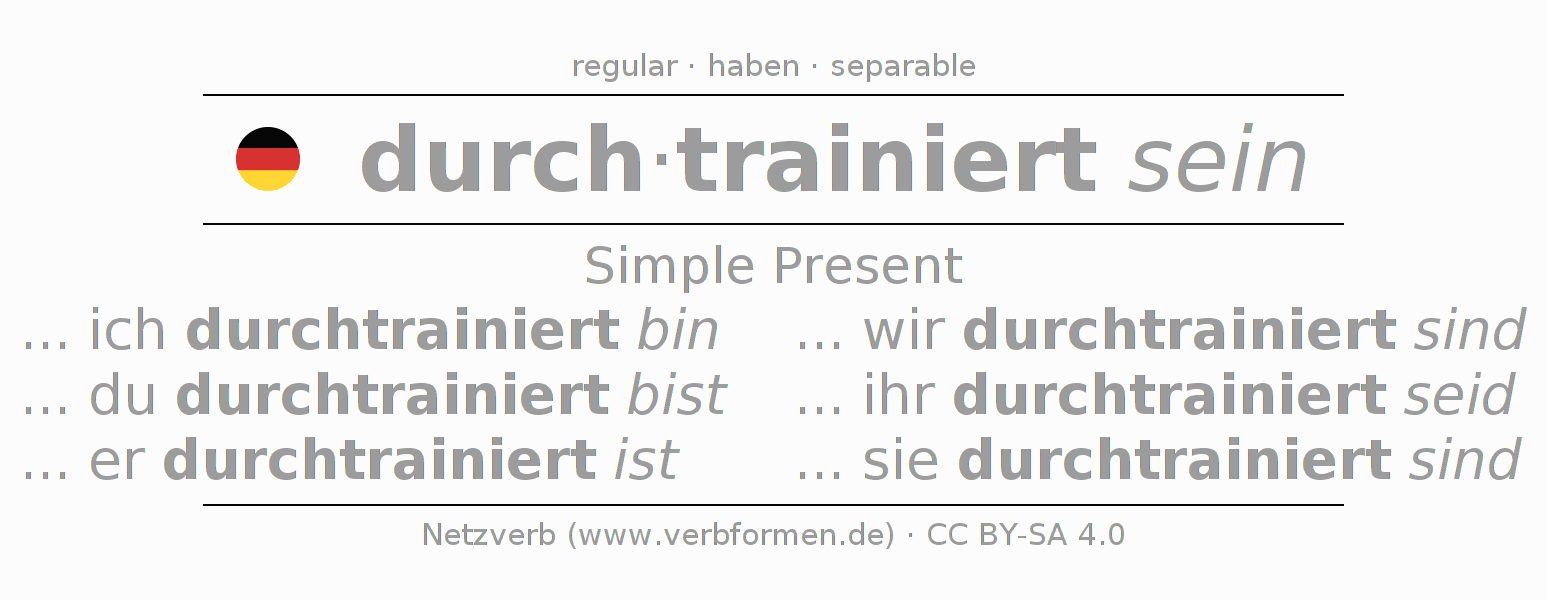 The conjugation of durchtrainieren in Present Indicative Presence Statal Passive is ... ich durchtrainiert bin, ... du durchtrainiert bist, ... er durchtrainiert ist, ... wir durchtrainiert sind, ... ihr durchtrainiert seid, ... sie durchtrainiert sind.The conjugation corresponds to certain grammatical rules. Likewise the requirements for the conjugation of the simple verb forms of durchtrainieren in Present. Comments ☆