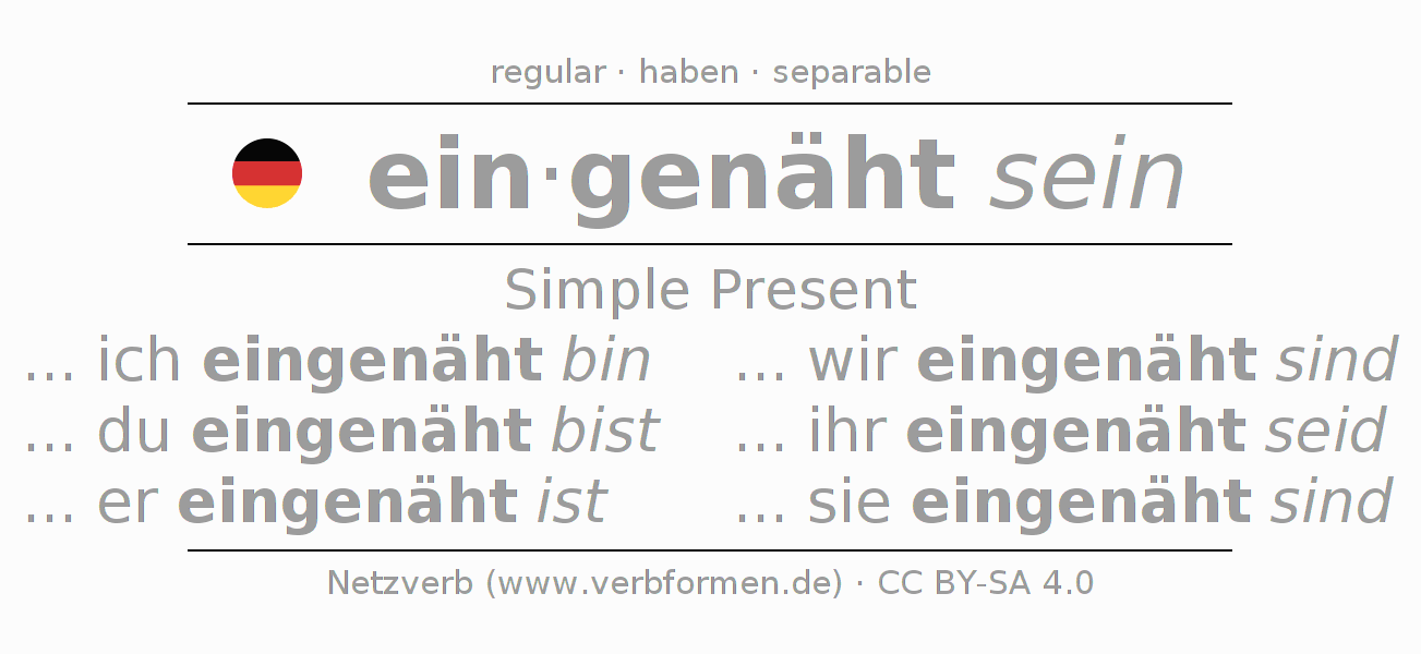 The conjugation of einnähen in Present Indicative Presence Statal Passive is ... ich eingenäht bin, ... du eingenäht bist, ... er eingenäht ist, ... wir eingenäht sind, ... ihr eingenäht seid, ... sie eingenäht sind.The conjugation corresponds to certain grammatical rules. Likewise the requirements for the conjugation of the simple verb forms of einnähen in Present. Comments ☆