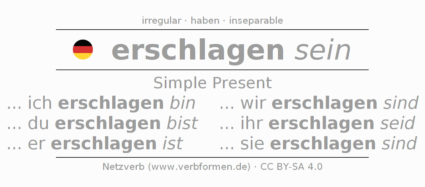 The conjugation of erschlagen in Present Indicative Presence Statal Passive is ... ich erschlagen bin, ... du erschlagen bist, ... er erschlagen ist, ... wir erschlagen sind, ... ihr erschlagen seid, ... sie erschlagen sind.The conjugation corresponds to certain grammatical rules. Likewise the requirements for the conjugation of the simple verb forms of erschlagen in Present. Comments ☆