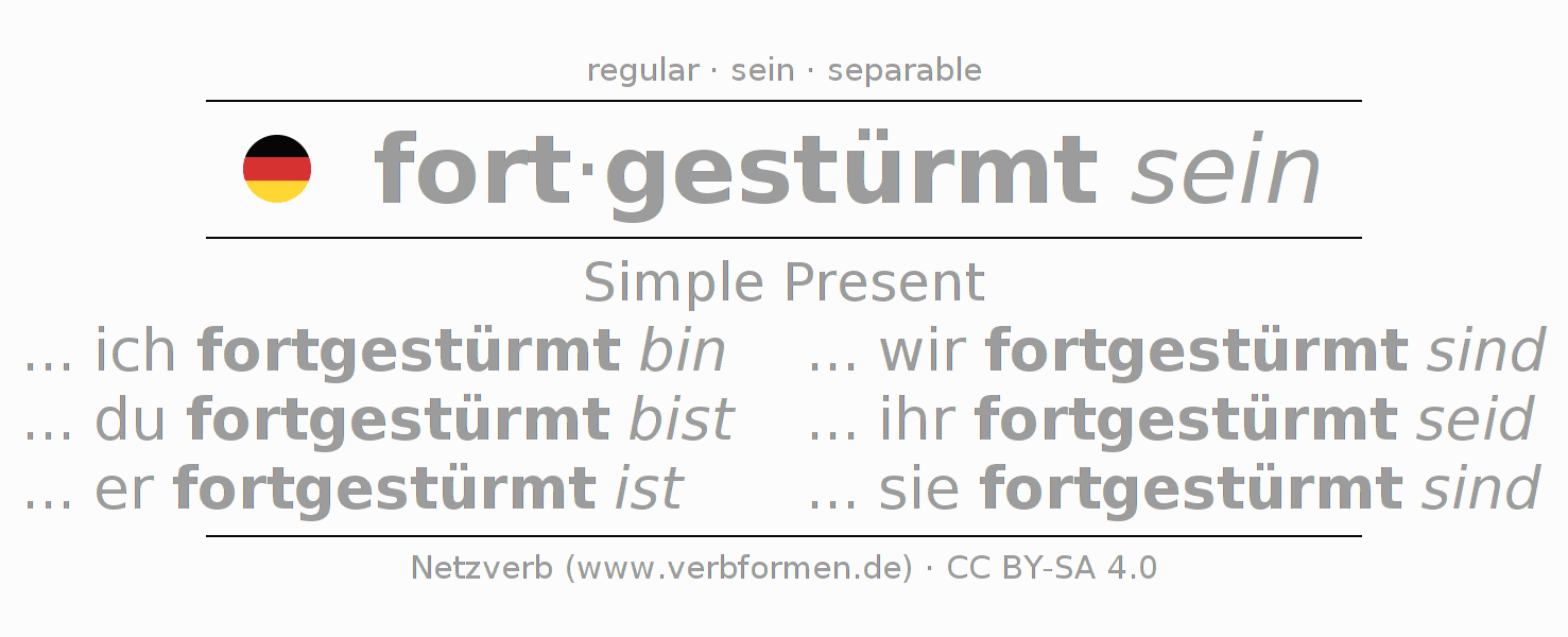 The verb fortstürmen fully conjugated in all persons and numbers in the Present Indicative