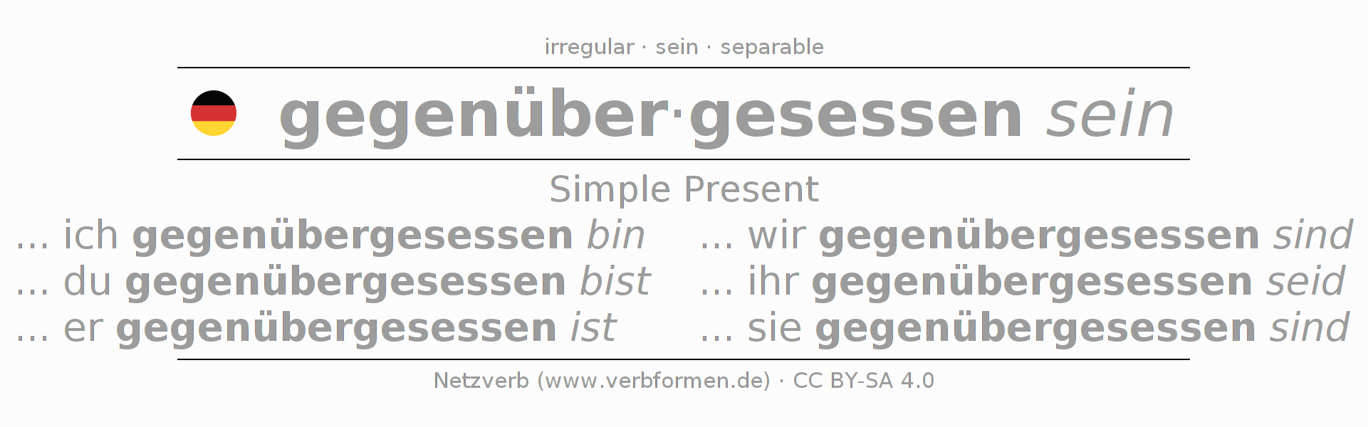 The verb gegenübersitzen (ist) fully conjugated in all persons and numbers in the Present Indicative