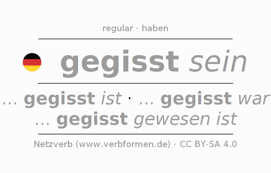 The conjugation of gissen in Present Indicative Presence Statal Passive is ... ich gegisst bin, ... du gegisst bist, ... er gegisst ist, ... wir gegisst sind, ... ihr gegisst seid, ... sie gegisst sind.The conjugation corresponds to certain grammatical rules. Likewise the requirements for the conjugation of the simple verb forms of gissen in Present. Comments ☆