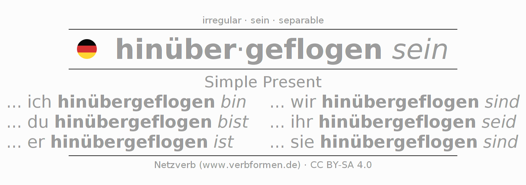 The verb hinüberfliegen (ist) fully conjugated in all persons and numbers in the Present Indicative