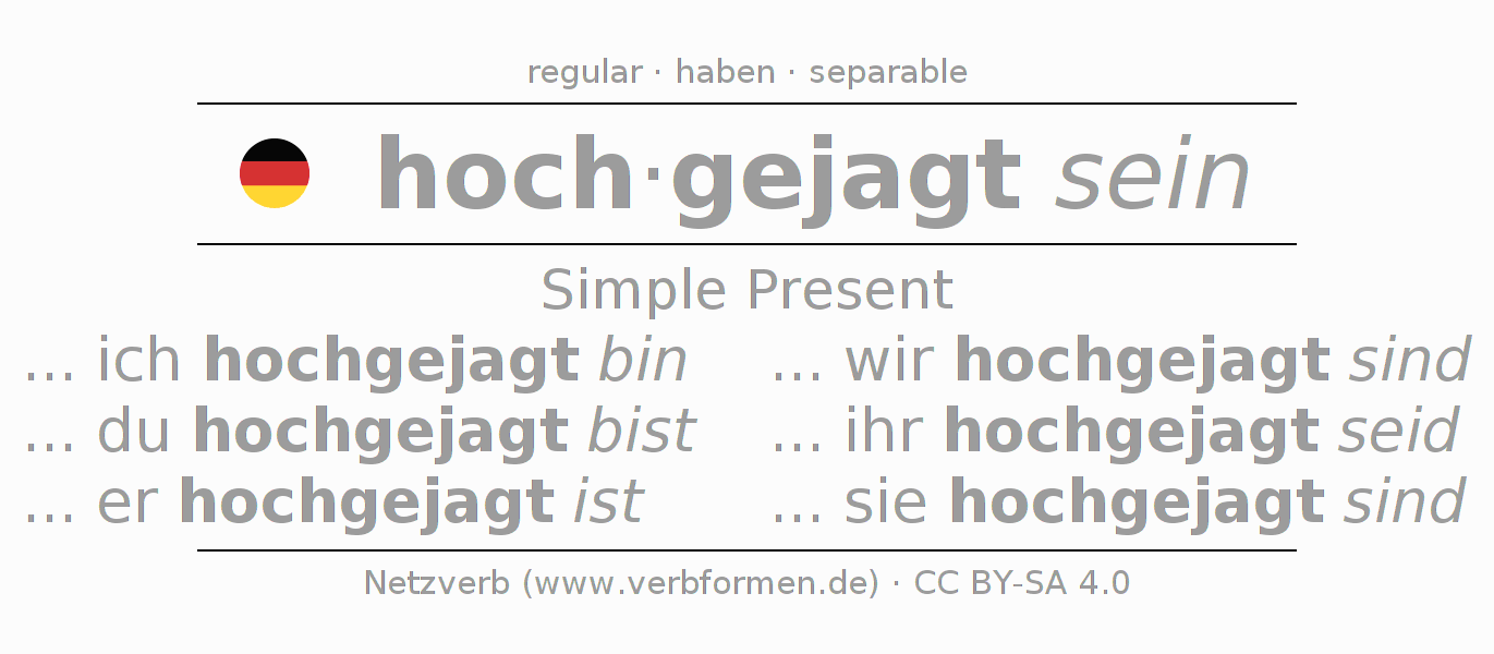 The conjugation of hochjagen in Present Indicative Presence Statal Passive is ... ich hochgejagt bin, ... du hochgejagt bist, ... er hochgejagt ist, ... wir hochgejagt sind, ... ihr hochgejagt seid, ... sie hochgejagt sind.The conjugation corresponds to certain grammatical rules. Likewise the requirements for the conjugation of the simple verb forms of hochjagen in Present. Comments ☆