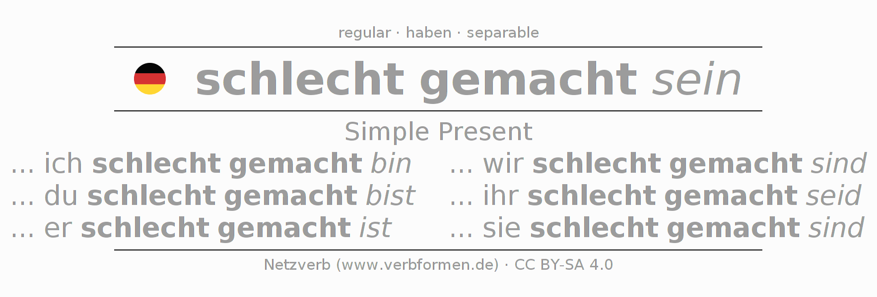 The conjugation of schlechtmachen in Present Indicative Presence Statal Passive is ... ich schlecht gemacht bin, ... du schlecht gemacht bist, ... er schlecht gemacht ist, ... wir schlecht gemacht sind, ... ihr schlecht gemacht seid, ... sie schlecht gemacht sind.The conjugation corresponds to certain grammatical rules. Likewise the requirements for the conjugation of the simple verb forms of schlechtmachen in Present. Comments ☆