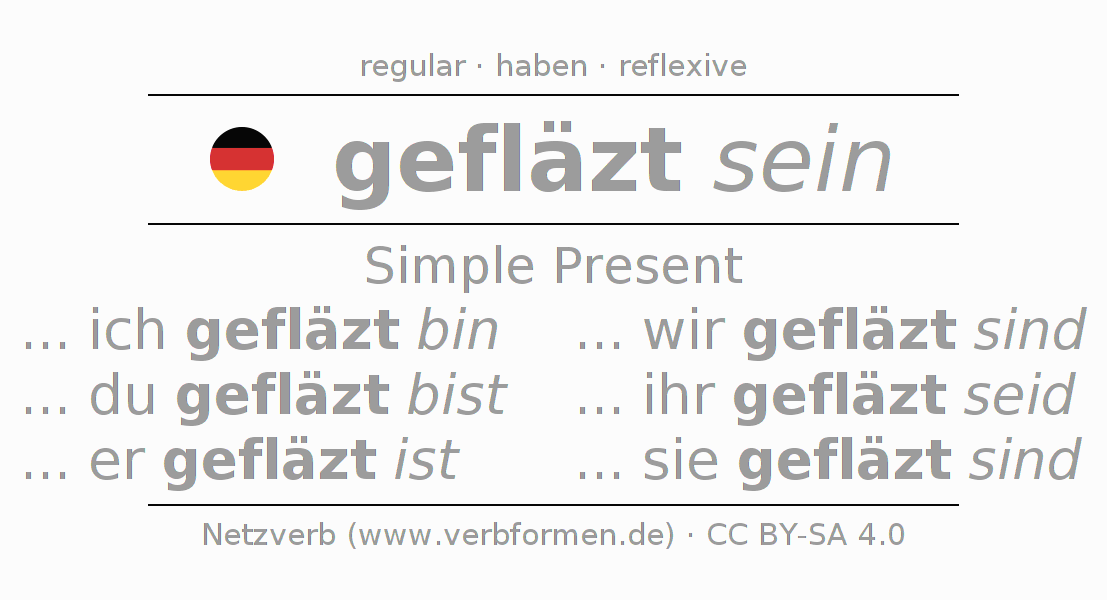 The conjugation of sich fläzen in Present Indicative Presence Statal Passive is ... ich gefläzt bin, ... du gefläzt bist, ... er gefläzt ist, ... wir gefläzt sind, ... ihr gefläzt seid, ... sie gefläzt sind.The conjugation corresponds to certain grammatical rules. Likewise the requirements for the conjugation of the simple verb forms of fläzen in Present. Comments ☆