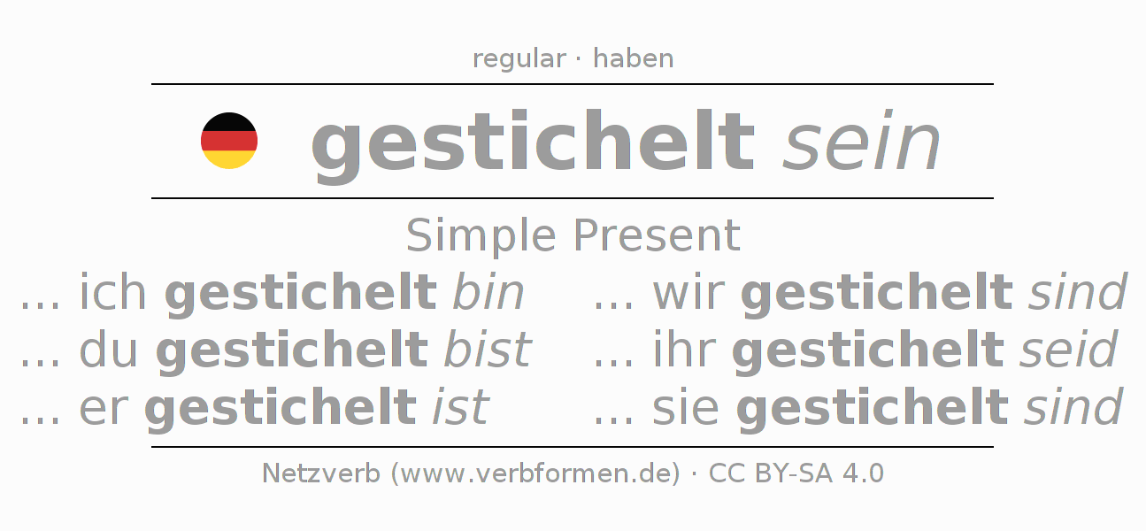 The conjugation of sticheln in Present Indicative Presence Statal Passive is ... ich gestichelt bin, ... du gestichelt bist, ... er gestichelt ist, ... wir gestichelt sind, ... ihr gestichelt seid, ... sie gestichelt sind.The conjugation corresponds to certain grammatical rules. Likewise the requirements for the conjugation of the simple verb forms of sticheln in Present. Comments ☆