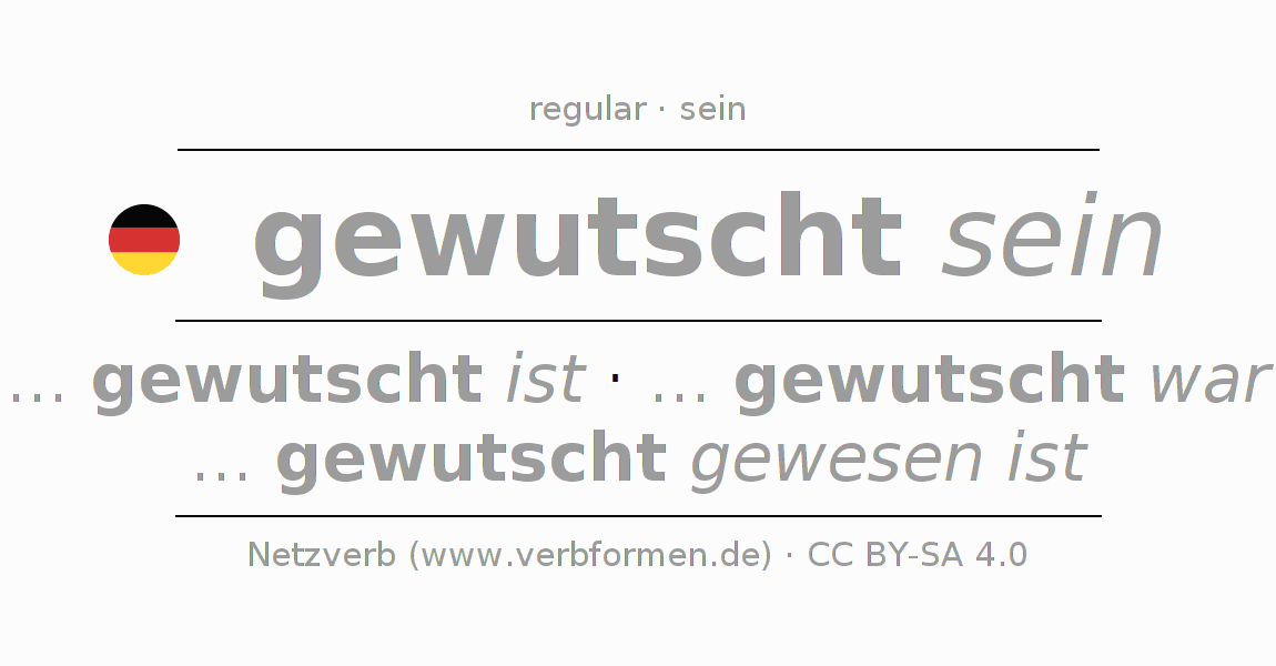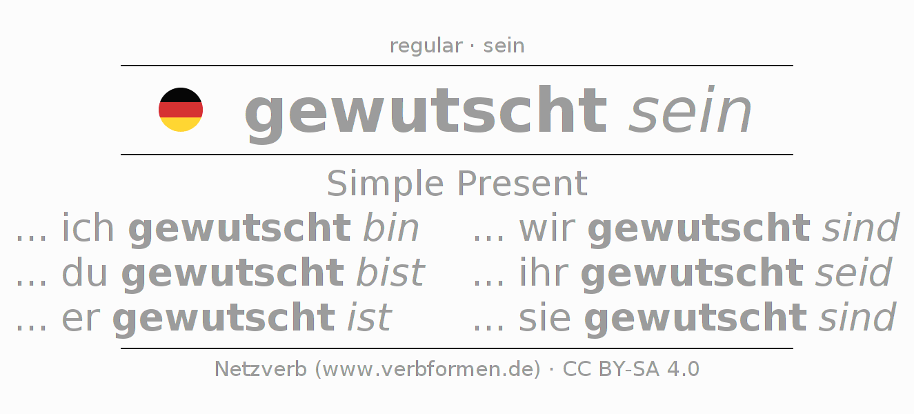 The conjugation of wutschen in Present Indicative Presence Statal Passive is ... ich gewutscht bin, ... du gewutscht bist, ... er gewutscht ist, ... wir gewutscht sind, ... ihr gewutscht seid, ... sie gewutscht sind.The conjugation corresponds to certain grammatical rules. Likewise the requirements for the conjugation of the simple verb forms of wutschen in Present. Comments ☆