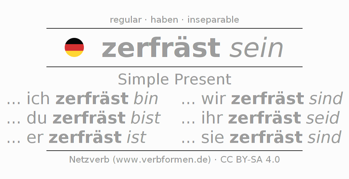 The verb zerfräsen fully conjugated in all persons and numbers in the Present Indicative