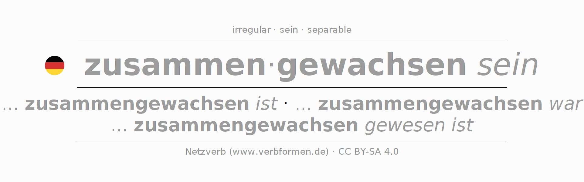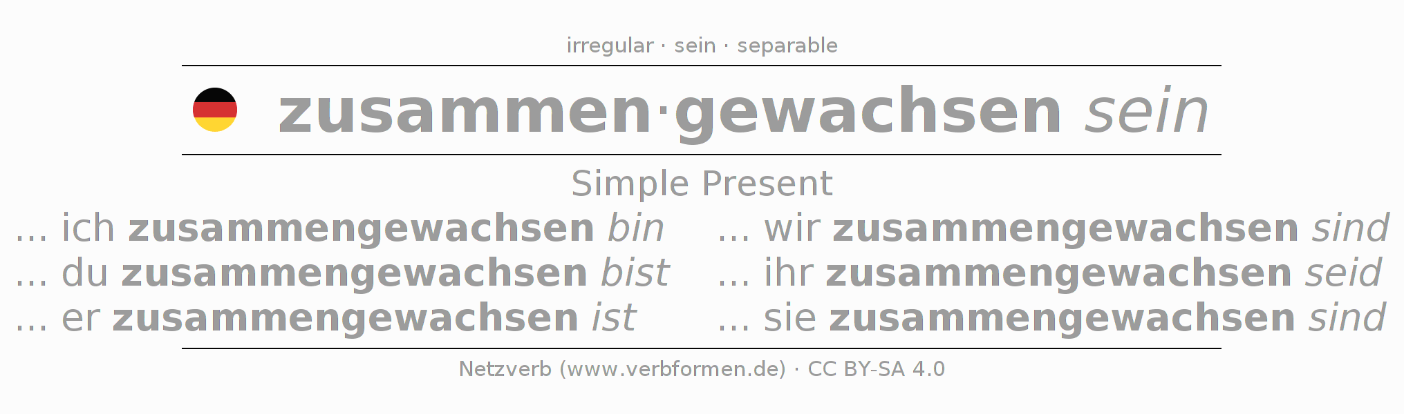 The conjugation of zusammenwachsen in Present Indicative Presence Statal Passive is ... ich zusammengewachsen bin, ... du zusammengewachsen bist, ... er zusammengewachsen ist, ... wir zusammengewachsen sind, ... ihr zusammengewachsen seid, ... sie zusammengewachsen sind.The conjugation corresponds to certain grammatical rules. Likewise the requirements for the conjugation of the simple verb forms of zusammenwachsen in Present. Comments ☆