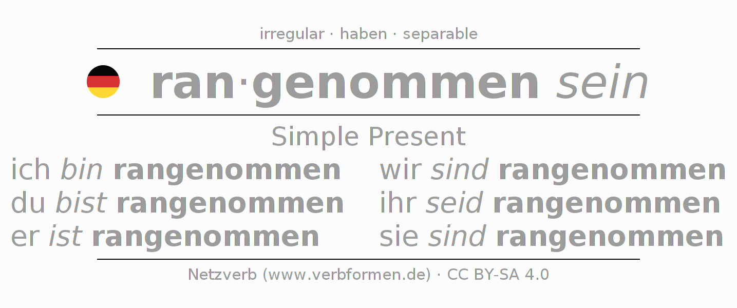 The conjugation of rannehmen in Present Indicative Presence Statal Passive is ich bin rangenommen, du bist rangenommen, er ist rangenommen, wir sind rangenommen, ihr seid rangenommen, sie sind rangenommen.The conjugation corresponds to certain grammatical rules. Likewise the requirements for the conjugation of the simple verb forms of rannehmen in Present. Comments ☆
