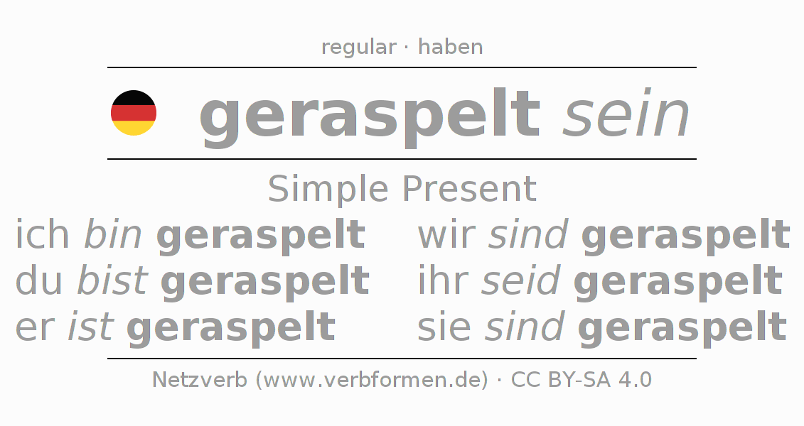 The conjugation of raspeln in Present Indicative Presence Statal Passive is ich bin geraspelt, du bist geraspelt, er ist geraspelt, wir sind geraspelt, ihr seid geraspelt, sie sind geraspelt.The conjugation corresponds to certain grammatical rules. Likewise the requirements for the conjugation of the simple verb forms of raspeln in Present. Comments ☆