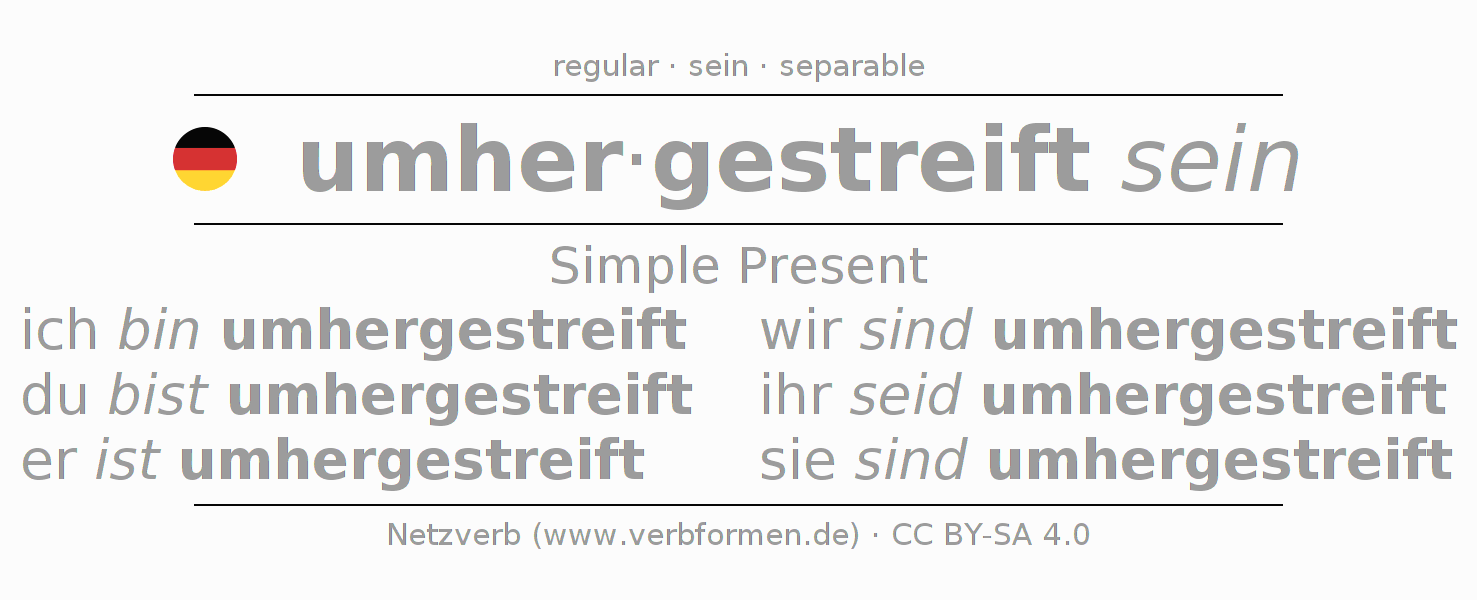 The conjugation of umherstreifen in Present Indicative Presence Statal Passive is ich bin umhergestreift, du bist umhergestreift, er ist umhergestreift, wir sind umhergestreift, ihr seid umhergestreift, sie sind umhergestreift.The conjugation corresponds to certain grammatical rules. Likewise the requirements for the conjugation of the simple verb forms of umherstreifen in Present. Comments ☆