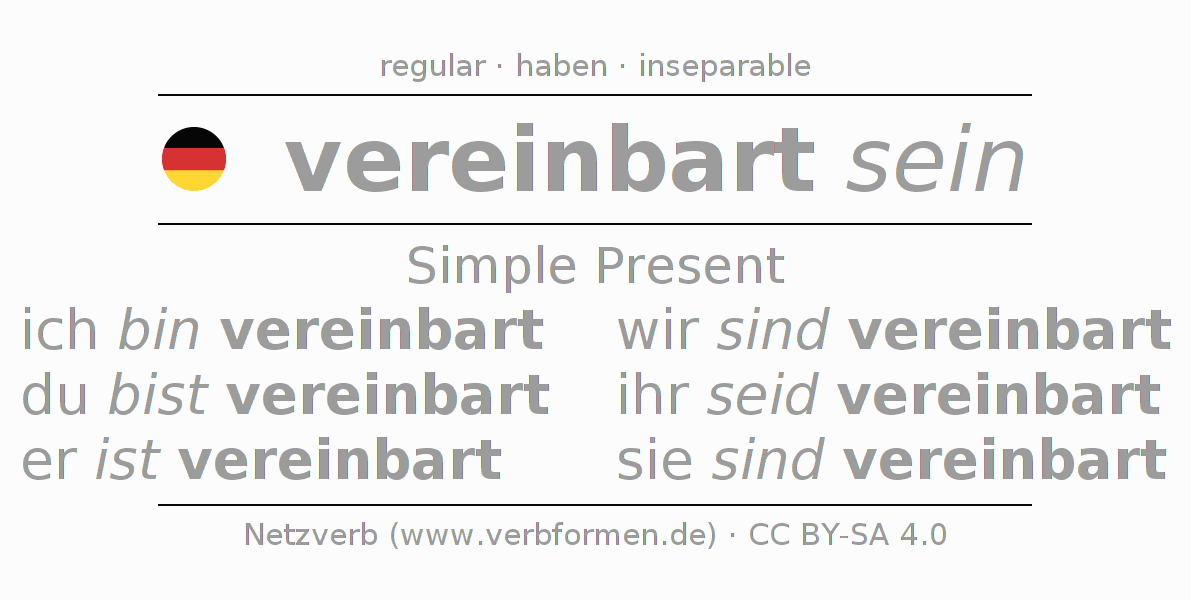 The conjugation of vereinbaren in Present Indicative Presence Statal Passive is ich bin vereinbart, du bist vereinbart, er ist vereinbart, wir sind vereinbart, ihr seid vereinbart, sie sind vereinbart.The conjugation corresponds to certain grammatical rules. Likewise the requirements for the conjugation of the simple verb forms of vereinbaren in Present. Comments ☆