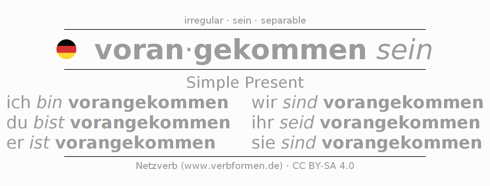 The verb vorankommen fully conjugated in all persons and numbers in the Present Indicative