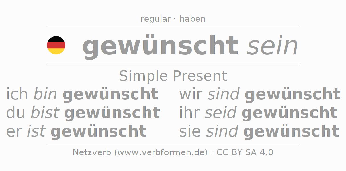 The conjugation of wünschen in Present Indicative Presence Statal Passive is ich bin gewünscht, du bist gewünscht, er ist gewünscht, wir sind gewünscht, ihr seid gewünscht, sie sind gewünscht.The conjugation corresponds to certain grammatical rules. Likewise the requirements for the conjugation of the simple verb forms of wünschen in Present. Comments ☆