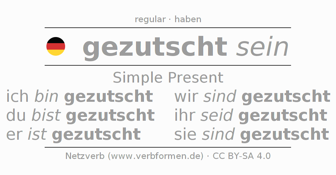 The conjugation of zutschen in Present Indicative Presence Statal Passive is ich bin gezutscht, du bist gezutscht, er ist gezutscht, wir sind gezutscht, ihr seid gezutscht, sie sind gezutscht.The conjugation corresponds to certain grammatical rules. Likewise the requirements for the conjugation of the simple verb forms of zutschen in Present. Comments ☆