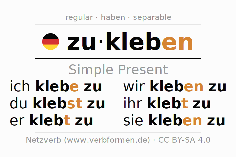 The verb zukleben fully conjugated in all persons and numbers in the Present Indicative