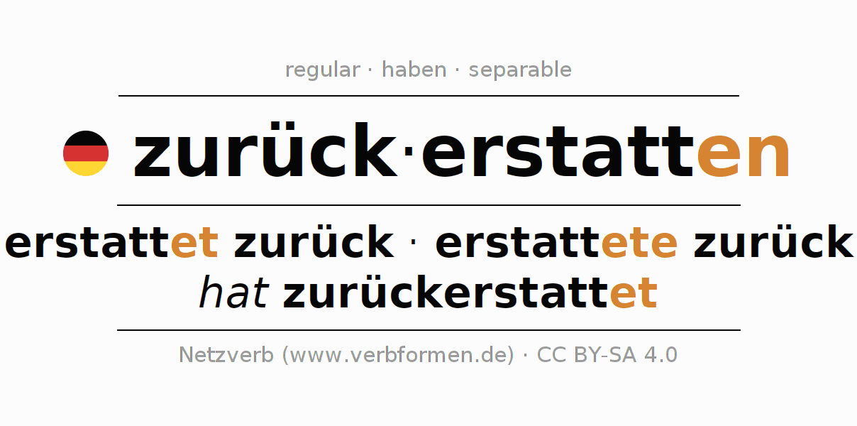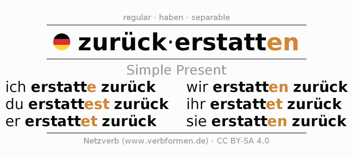 The conjugation of zurückerstatten (reimburse, refund) in the present tense is: ich erstatte zurück, du erstattest zurück, er erstattet zurück, wir erstatten zurück, ihr erstattet zurück, sie erstatten zurück. For this purpose, the endings -e, -est, -et, -en, -et, -en are appended to the stem statt. The endings in the 2nd and 3rd person singular and in the 2nd person plural are extended by "e", as the stem ends on -t. The prefix zurück- of zurückerstatten is separated.The formation of the forms corresponds to the grammatical rules for the conjugation of the verbs in the present tense. Comments ☆