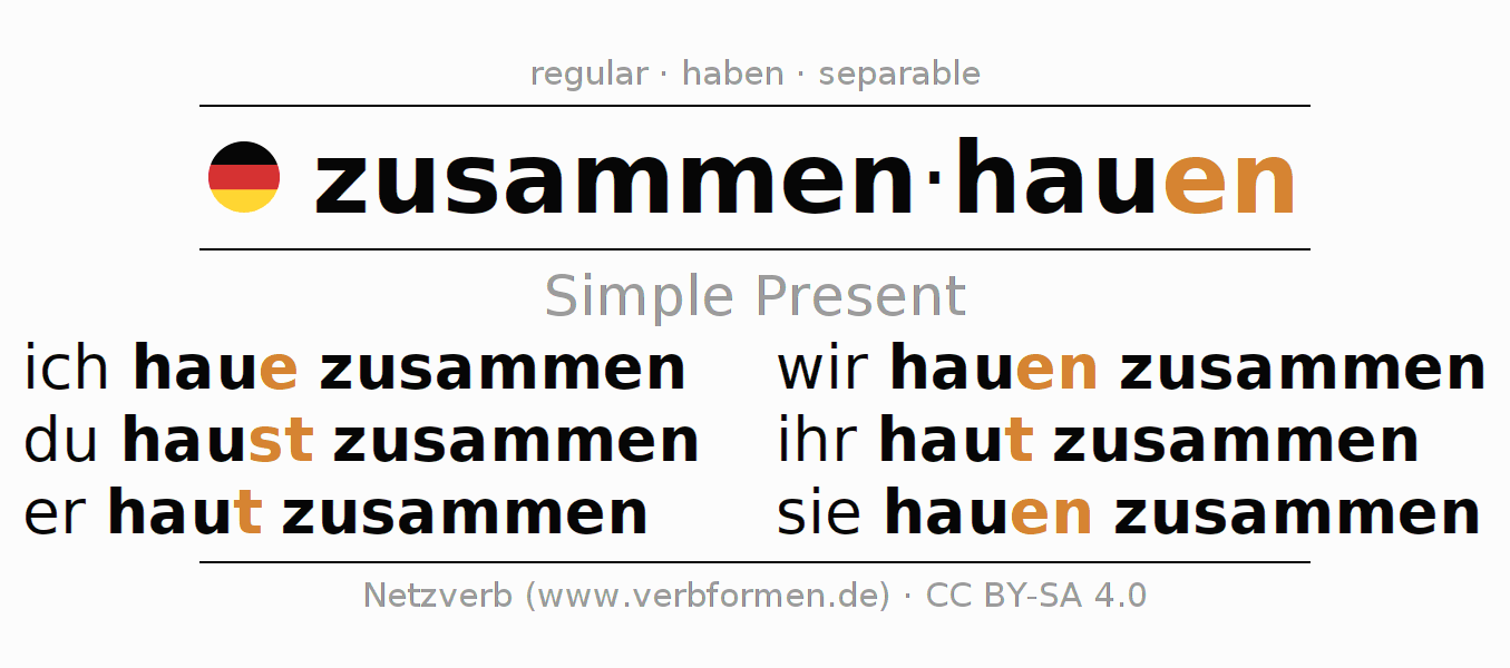 The verb zusammenhauen fully conjugated in all persons and numbers in the Present Indicative