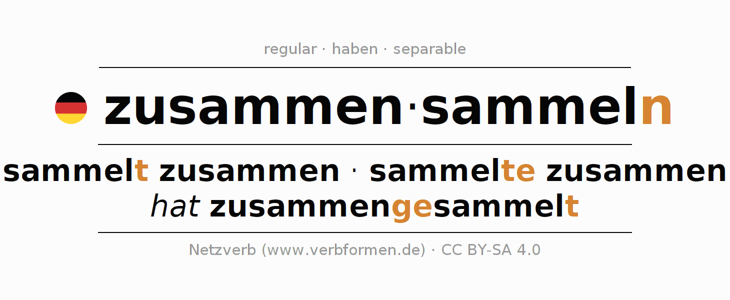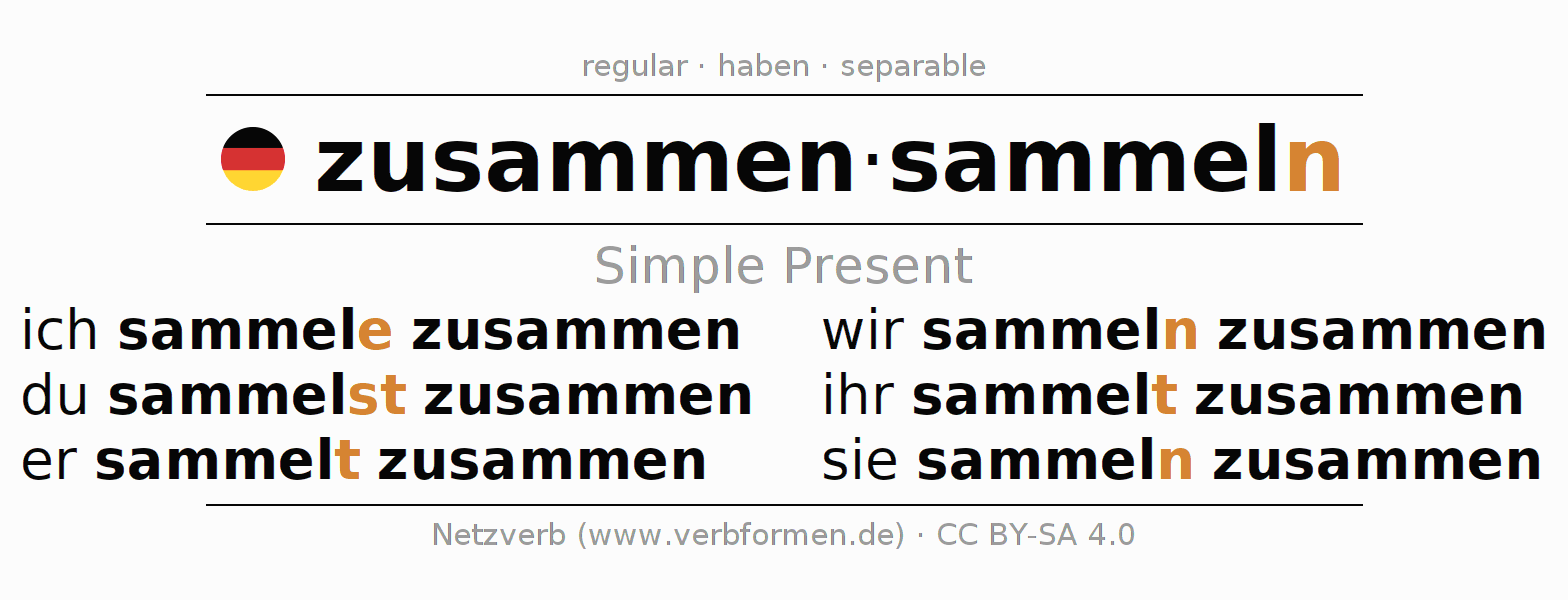 The conjugation of zusammensammeln (collect, gather) in the present tense is: ich samm(e)le zusammen, du sammelst zusammen, er sammelt zusammen, wir sammeln zusammen, ihr sammelt zusammen, sie sammeln zusammen. For this purpose, the endings -e, -st, -t, -n, -t, -n are appended to the stem sammel. The endings in the 1st and 3rd person plural are shortened by "e", since the verb ends with -eln.In addition, the "e" in the stem can be omitted in the 1st person singular. The prefix zusammen- of zusammensammeln is separated.The formation of the forms corresponds to the grammatical rules for the conjugation of the verbs in the present tense. Comments ☆