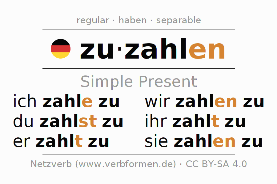 The conjugation of zuzahlen (pay extra, add) in the present tense is: ich zahle zu, du zahlst zu, er zahlt zu, wir zahlen zu, ihr zahlt zu, sie zahlen zu. For this purpose, the endings -e, -st, -t, -en, -t, -en are appended to the stem zahl. The prefix zu- of zuzahlen is separated.The formation of the forms corresponds to the grammatical rules for the conjugation of the verbs in the present tense. Comments ☆