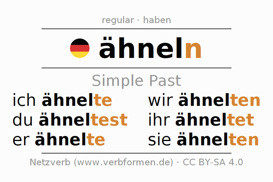 The conjugation of ähneln (resemble, be alike) in the past tense is ich ähnelte, du ähneltest, er ähnelte, wir ähnelten, ihr ähneltet, sie ähnelten. As a regular verb the unmodified stem ähnel- is used. The preterite endings -te, -test, -te, -ten, -tet, -ten are appended to this stem.The conjugation of these forms conforms to the grammatical rules for verbs in the past tense. Comments ☆