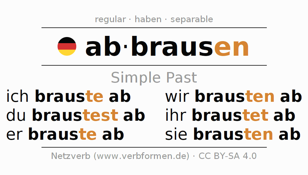 The conjugation of abbrausen (rinse off) in the past tense is ich brauste ab, du braustest ab, er brauste ab, wir brausten ab, ihr braustet ab, sie brausten ab. As a regular verb the unmodified stem braus- is used. The preterite endings -te, -test, -te, -ten, -tet, -ten are appended to this stem.The prefix ab- of abbrausen is separated.The conjugation of these forms conforms to the grammatical rules for verbs in the past tense. Comments ☆