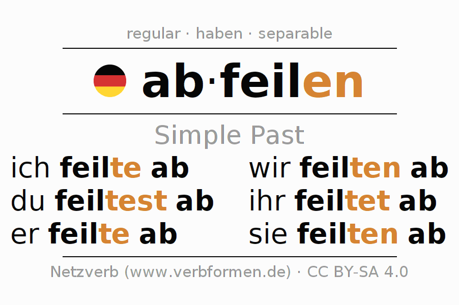 The conjugation of abfeilen (file down, file away) in the past tense is ich feilte ab, du feiltest ab, er feilte ab, wir feilten ab, ihr feiltet ab, sie feilten ab. As a regular verb the unmodified stem feil- is used. The preterite endings -te, -test, -te, -ten, -tet, -ten are appended to this stem.The prefix ab- of abfeilen is separated.The conjugation of these forms conforms to the grammatical rules for verbs in the past tense. Comments ☆