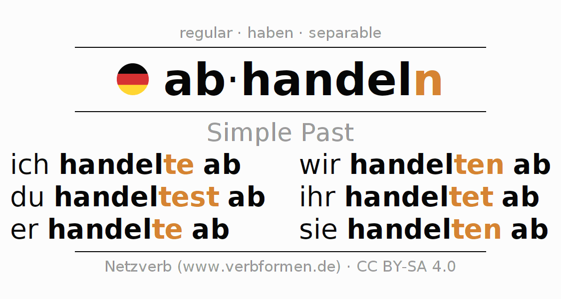 The conjugation of abhandeln (discuss, address) in the past tense is ich handelte ab, du handeltest ab, er handelte ab, wir handelten ab, ihr handeltet ab, sie handelten ab. As a regular verb the unmodified stem handel- is used. The preterite endings -te, -test, -te, -ten, -tet, -ten are appended to this stem.The prefix ab- of abhandeln is separated.The conjugation of these forms conforms to the grammatical rules for verbs in the past tense. Comments ☆