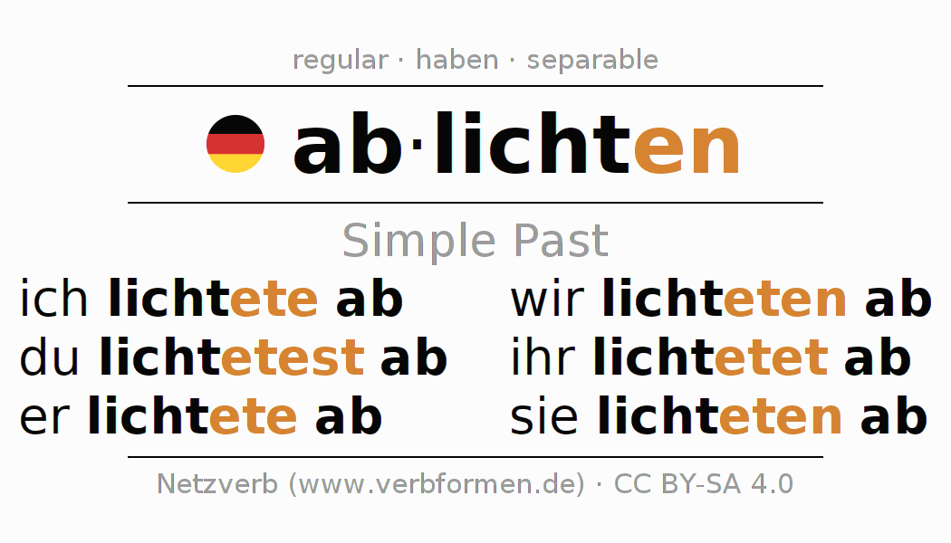 The conjugation of ablichten (copy, mug) in the past tense is ich lichtete ab, du lichtetest ab, er lichtete ab, wir lichteten ab, ihr lichtetet ab, sie lichteten ab. As a regular verb the unmodified stem licht- is used. The preterite endings -ete, -etest, -ete, -eten, -etet, -eten are appended to this stem.The endings are extended by "e", as the stem ends on -t.The prefix ab- of ablichten is separated.The conjugation of these forms conforms to the grammatical rules for verbs in the past tense. Comments ☆