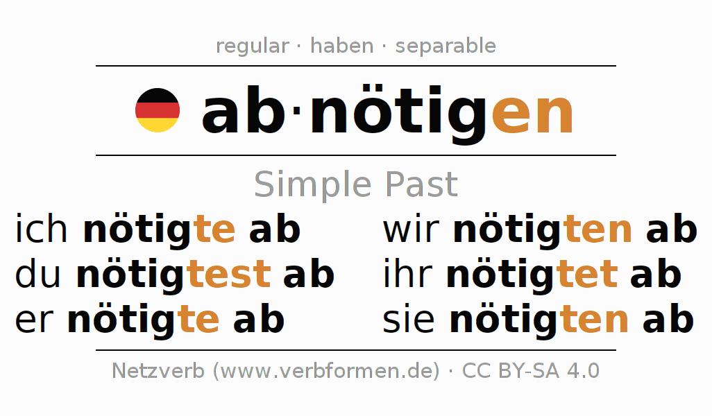 The conjugation of abnötigen (coerce, extort) in the past tense is ich nötigte ab, du nötigtest ab, er nötigte ab, wir nötigten ab, ihr nötigtet ab, sie nötigten ab. As a regular verb the unmodified stem nötig- is used. The preterite endings -te, -test, -te, -ten, -tet, -ten are appended to this stem.The prefix ab- of abnötigen is separated.The conjugation of these forms conforms to the grammatical rules for verbs in the past tense. Comments ☆
