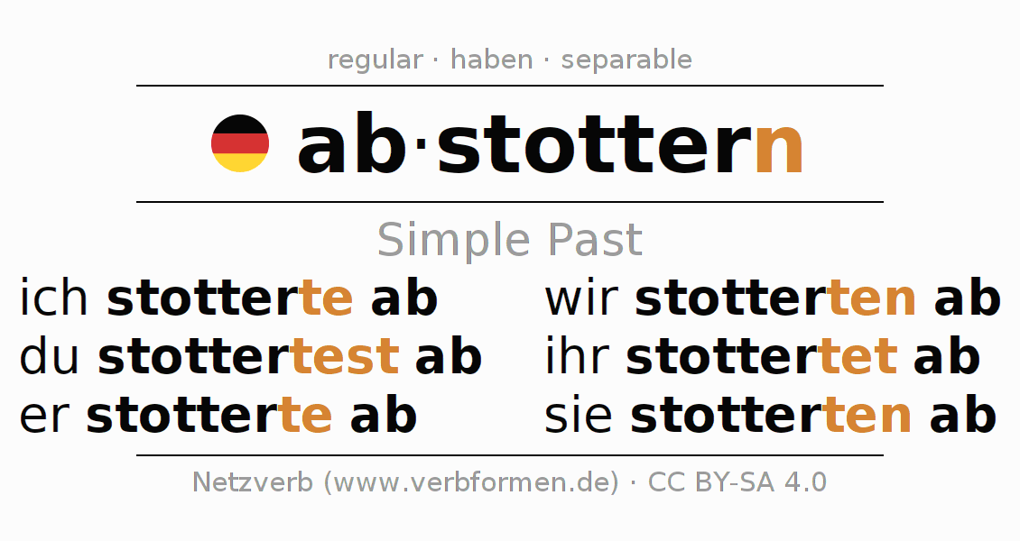 The conjugation of abstottern (pay off, installment payment) in the past tense is ich stotterte ab, du stottertest ab, er stotterte ab, wir stotterten ab, ihr stottertet ab, sie stotterten ab. As a regular verb the unmodified stem stotter- is used. The preterite endings -te, -test, -te, -ten, -tet, -ten are appended to this stem.The prefix ab- of abstottern is separated.The conjugation of these forms conforms to the grammatical rules for verbs in the past tense. Comments ☆