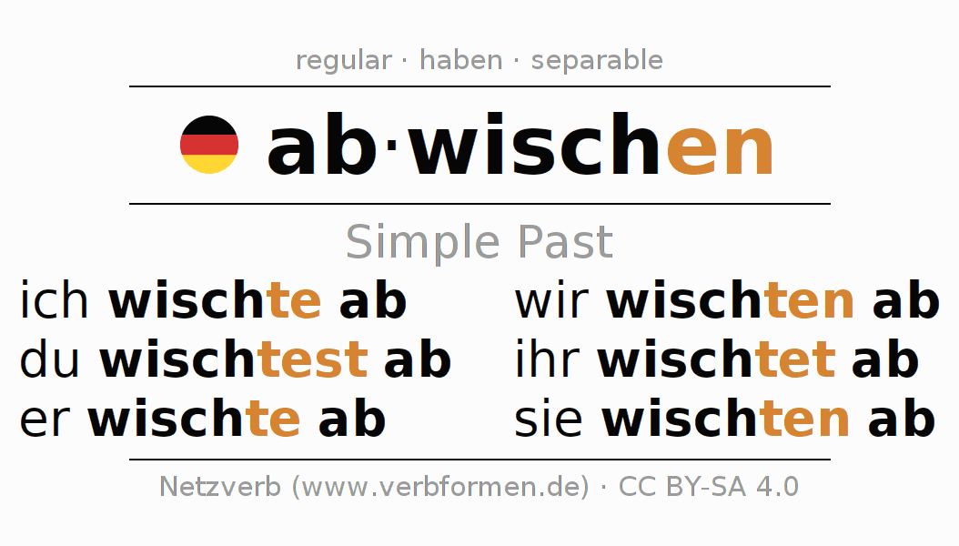 The conjugation of abwischen (wipe, wipe away) in the past tense is ich wischte ab, du wischtest ab, er wischte ab, wir wischten ab, ihr wischtet ab, sie wischten ab. As a regular verb the unmodified stem wisch- is used. The preterite endings -te, -test, -te, -ten, -tet, -ten are appended to this stem.The prefix ab- of abwischen is separated.The conjugation of these forms conforms to the grammatical rules for verbs in the past tense. Comments ☆
