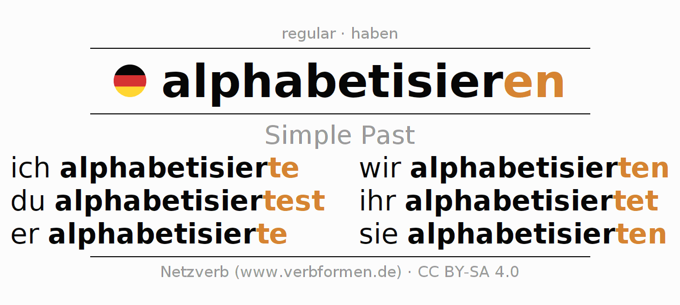 The conjugation of alphabetisieren (alphabetize, alphabetise) in the past tense is ich alphabetisierte, du alphabetisiertest, er alphabetisierte, wir alphabetisierten, ihr alphabetisiertet, sie alphabetisierten. As a regular verb the unmodified stem alphabetisier- is used. The preterite endings -te, -test, -te, -ten, -tet, -ten are appended to this stem.The conjugation of these forms conforms to the grammatical rules for verbs in the past tense. Comments ☆